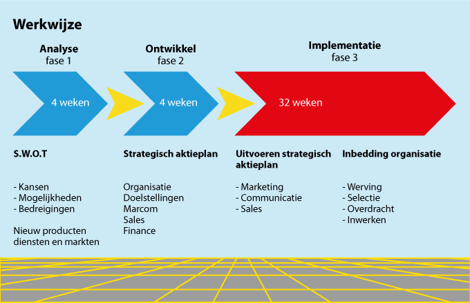 Een veel gehoorde opmerking van ondernemers is het gebrek aan tijd, kennis en mankracht om een New Business Development project op te zetten. Door het ‘tijdelijk’ uit te besteden voegt een ondernemer commerciële capaciteit en slagkracht toe aan de organisatie. De pragmatisch en projectmatige aanpak bestaat eenvoudigweg uit de volgende drie fases: